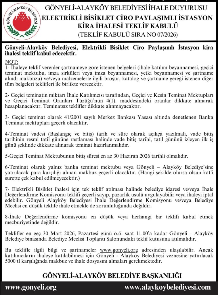 İHALE DUYURUSU – ELEKTRİKLİ BİSİKLET CİRO PAYLAŞIMLI İSTASYON KİRA İHALESİ